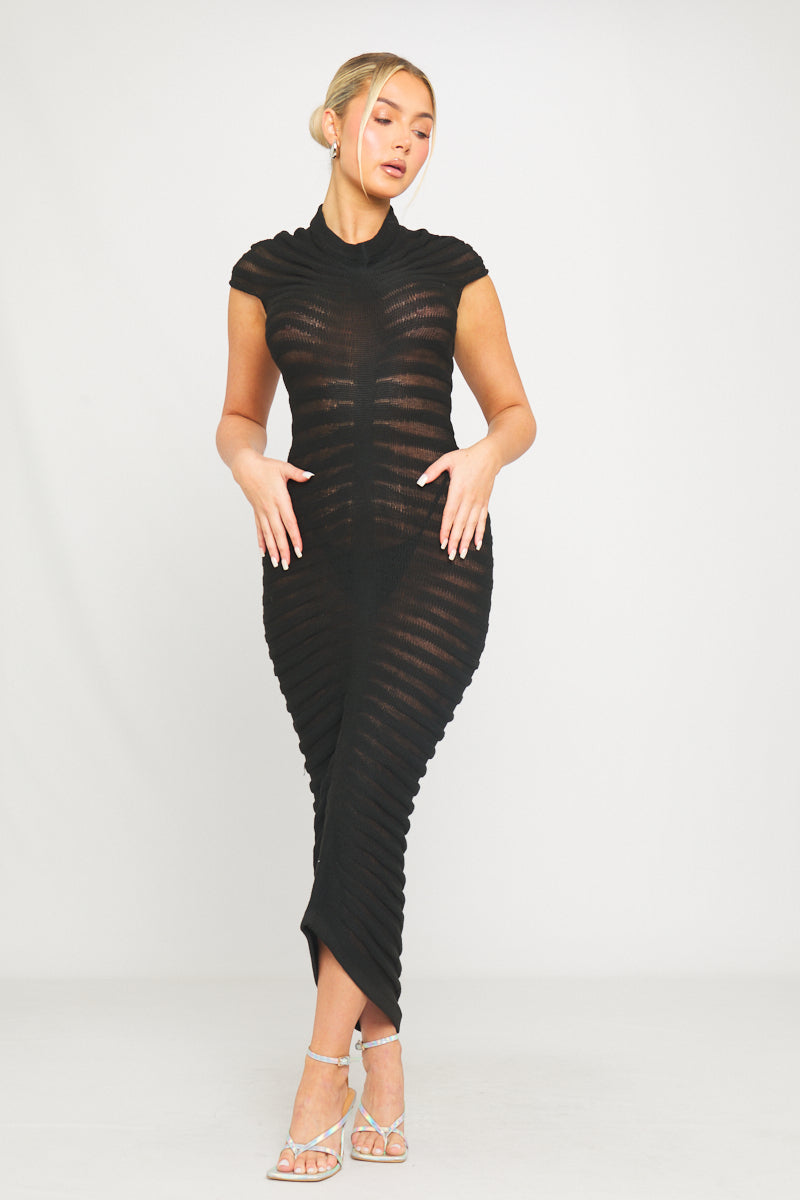 Black High Neck Sheer Knit Tube Short Sleeve Midi Dress