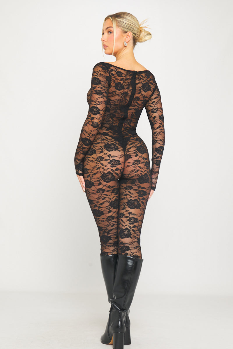 Black Lace Round Neck Long Sleeve Jumpsuit Catsuit