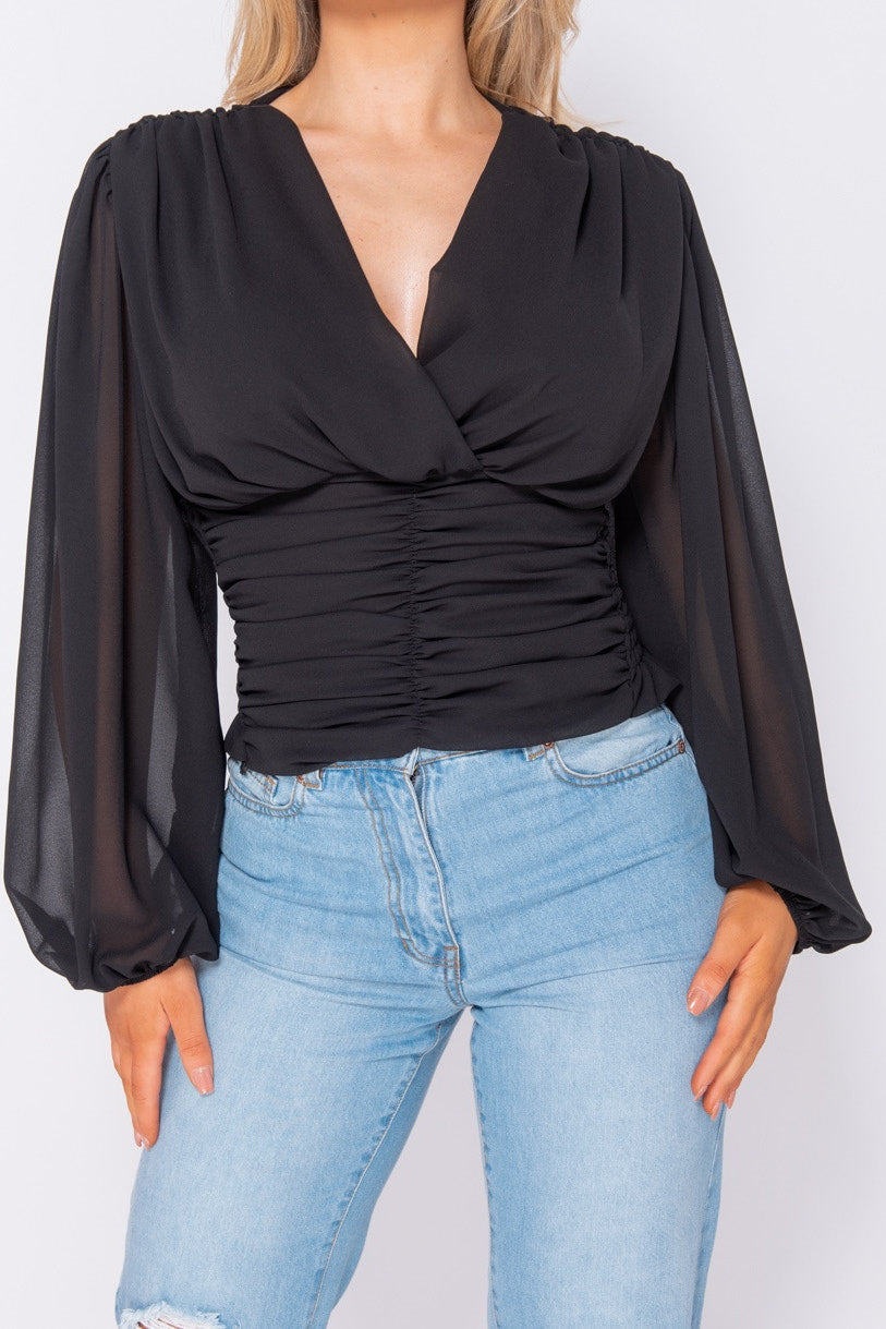 Black Puff Sleeve Ruched Wrap Front Top