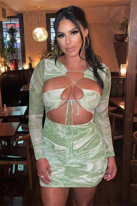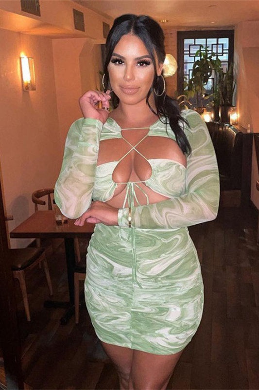 Green Marble Print Sheer Mesh Cut Out Mini Dress