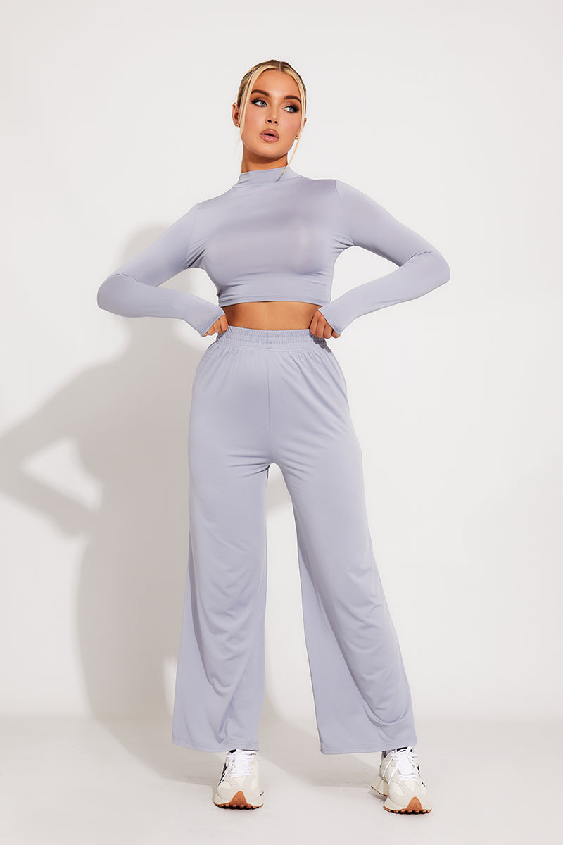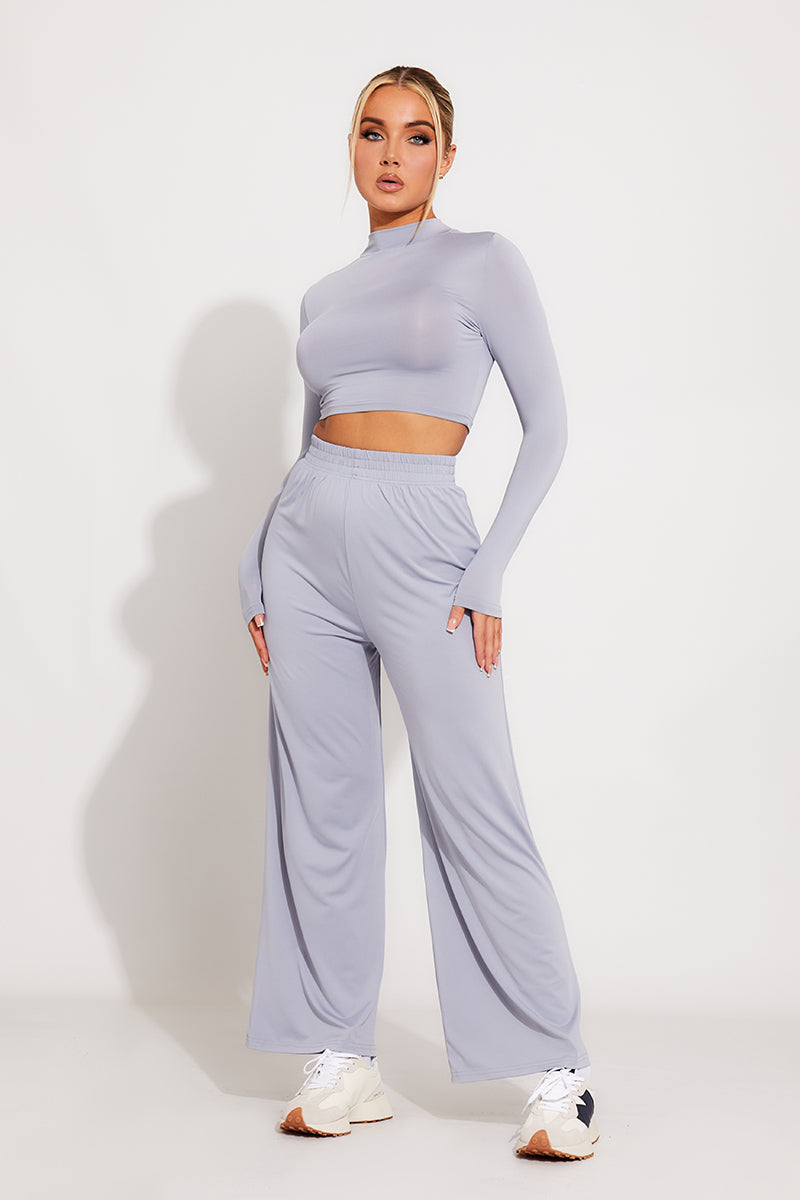 Grey High Neck Crop Top & Wide Leg Trousers Co-Ord