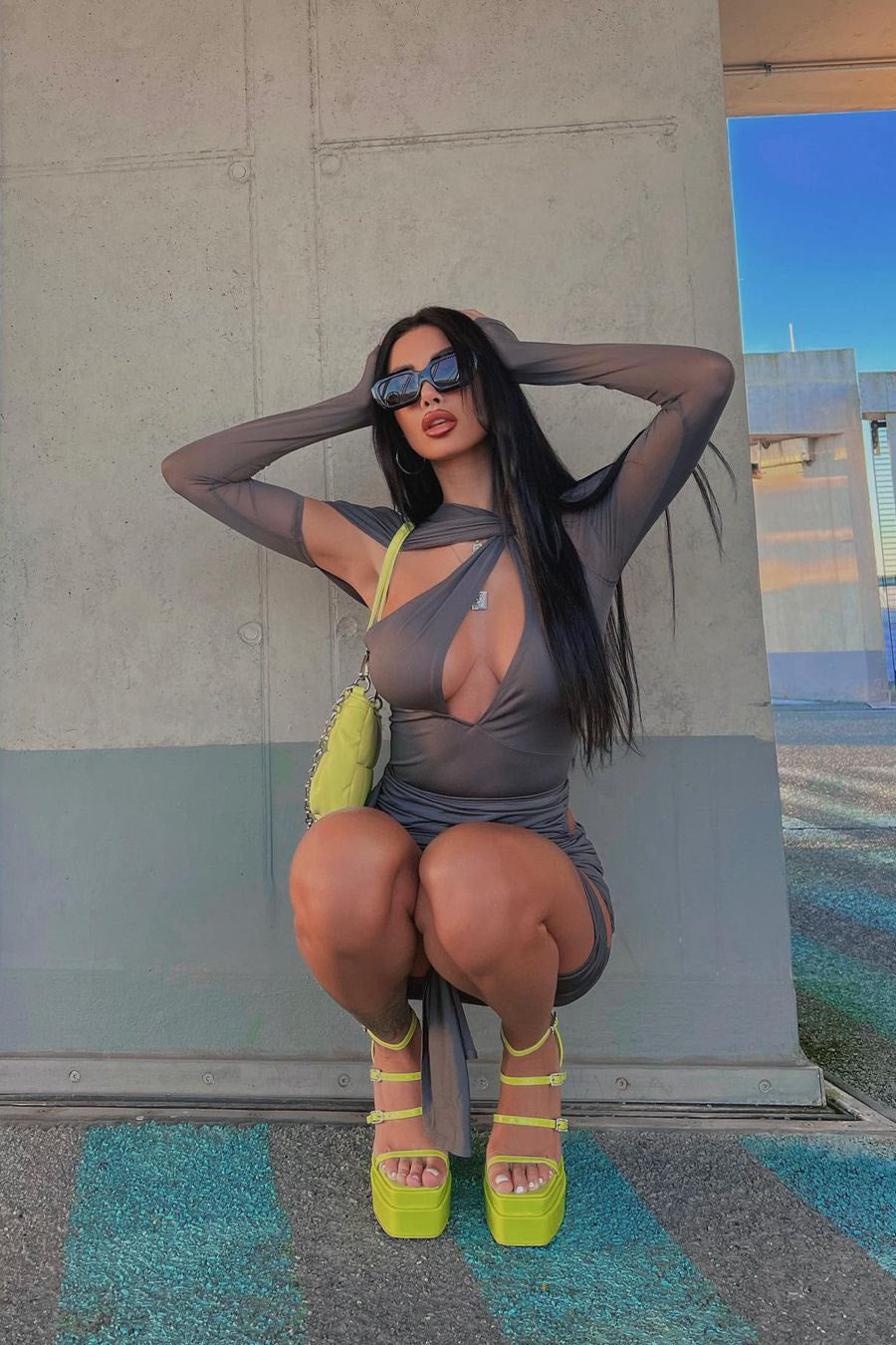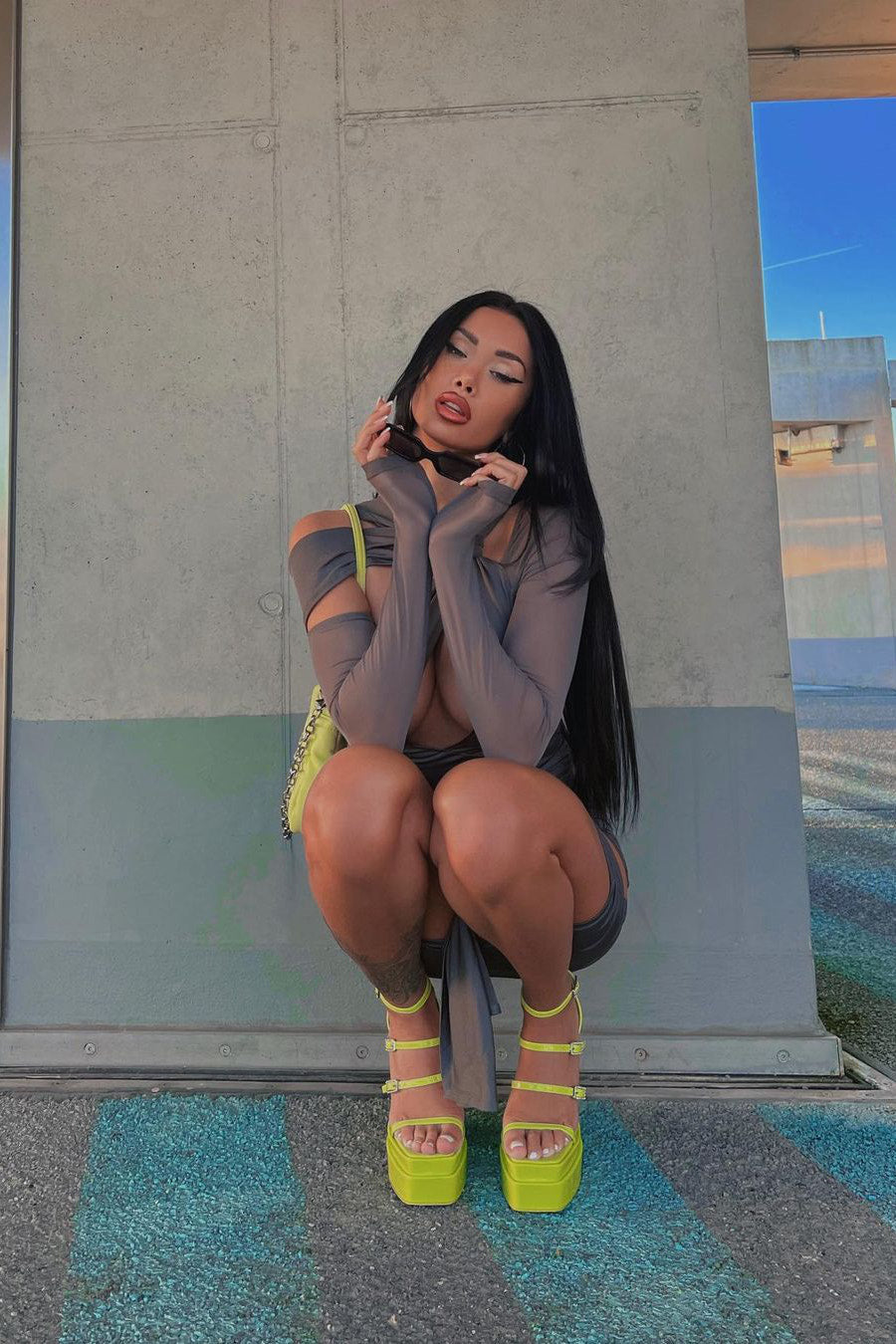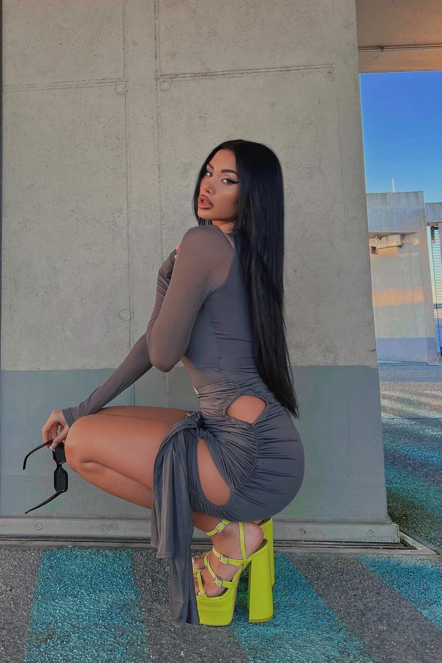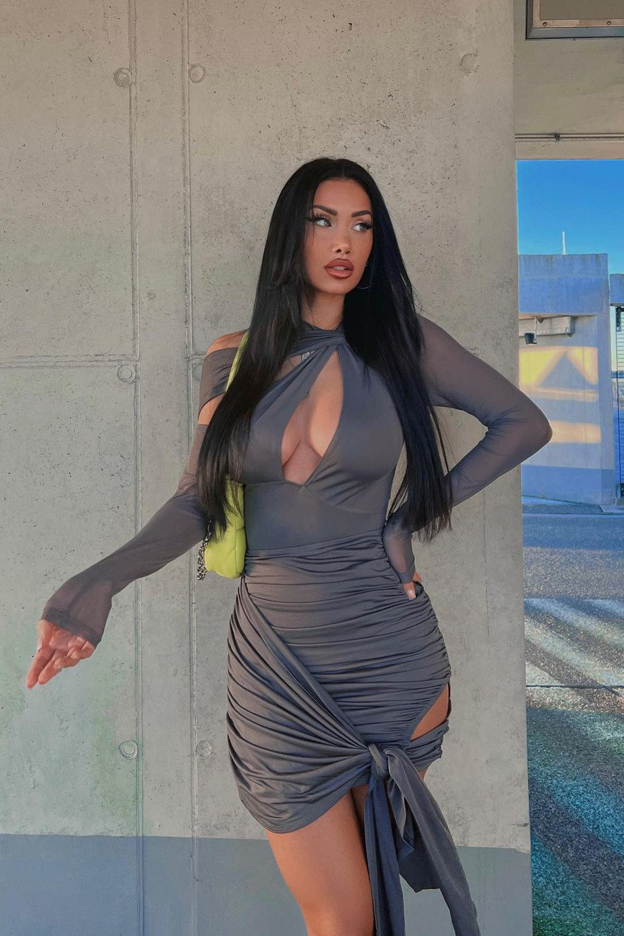 Grey Ruched Mesh Sleeve Cut Out Mini Dress