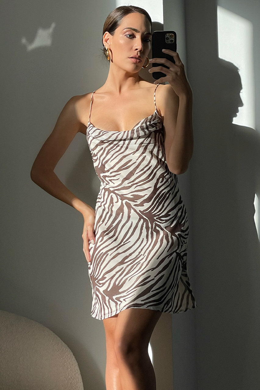 Zebra Print Cowl Neck Spaghetti Strap Mini Dress
